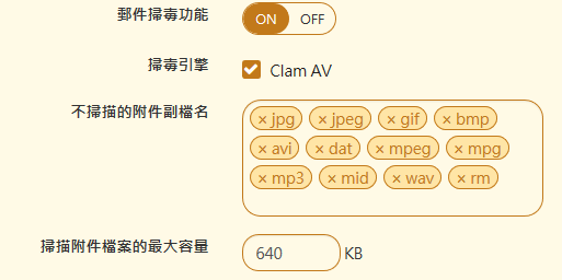 【掃毒引擎】:選擇要使用的掃毒引擎,目前郵件伺服器內建 ClamAV 及 Kaspersky 兩套掃毒引擎。