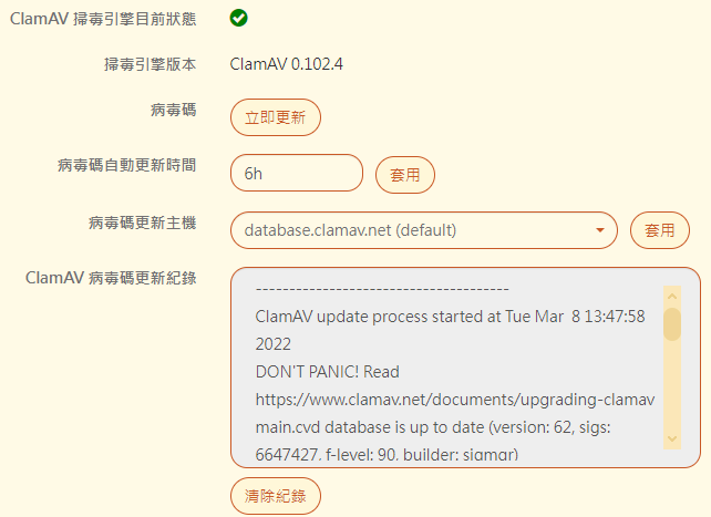 【ClamAV 病毒碼更新紀錄】:所有的更新過程都會被記錄下來,可以查看更新後增加了哪些病毒碼。也可將更新紀錄全部清除掉。