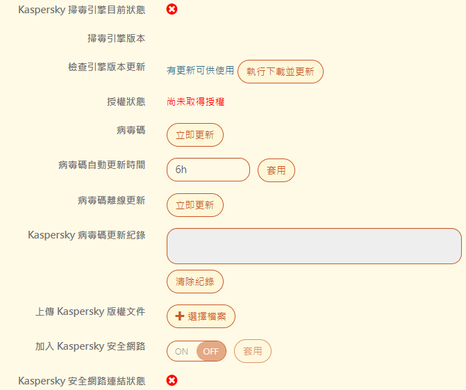 【上傳 Kaspersky 版權文件】:上傳授權文件後才能啟用引擎。