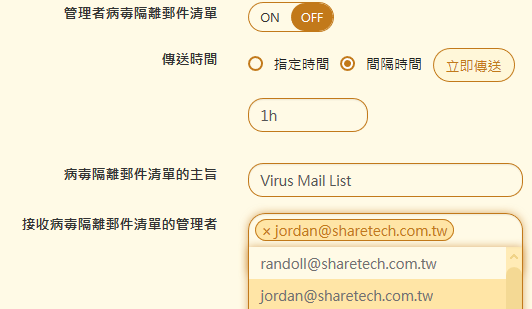 預設是關閉,啟用後,系統會將所有被病毒引擎判斷為中毒的郵件,以清單的方式寄給指定的收件者,這些收件者必須有管理者權限 如果在設定的時間內沒有任何中毒郵件,則這病毒清單郵件將不會發送。