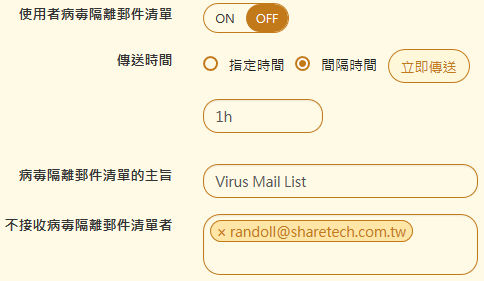 【使用者病毒隔離郵件清單】:預設是關閉,啟用後,系統會將所有中毒的郵件,以清單的方式寄給原本的收件者,如果在設定的時間內沒有任何中毒郵件,則這封清單郵件將不會發送。