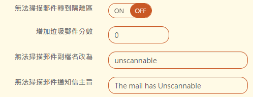 【無法掃描郵件通知信主旨】:如果沒有選擇將無法掃描郵件轉到隔離區,這封信仍會發送給收件者。 在主旨加上此設定的文字,提醒收件者這封信件未完成掃毒。