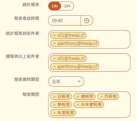 【統計報表的收件者】:根據【報表類型】的選擇,定期發送報表給設定的收件者。