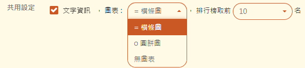 預設所有報表是否顯示文字資訊,及圖表的類型為橫條圖/圓餅圖,或不使用圖表。並且設定每份報表統計會取前幾名來做排行。