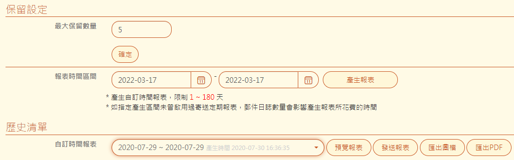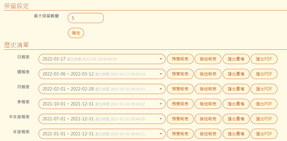 【最大保留數量】:在歷史清單中的報表保留數量,超過此設定值則會刪除最舊的報表。設定範圍 1~99。 例如:設定為 5,日報表會保留最近五日的報表共 5 筆、週報表會保留最近五週的報表共 5 筆 …… 以此類推。