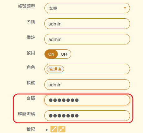 系統預設管理者帳號 admin/密碼 adminpw,而因為安全的因素,建議在設備連上網際網路後立刻更改。 由「認證與權限管理 > 7-2、使用者管理」,找到 admin 的帳號,點選編輯圖示進入修改密碼。