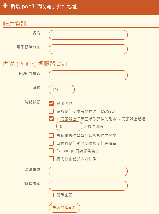 在「架構管理 > 6-3、POP3 代收」中新增 pop3 代收電子郵件地址