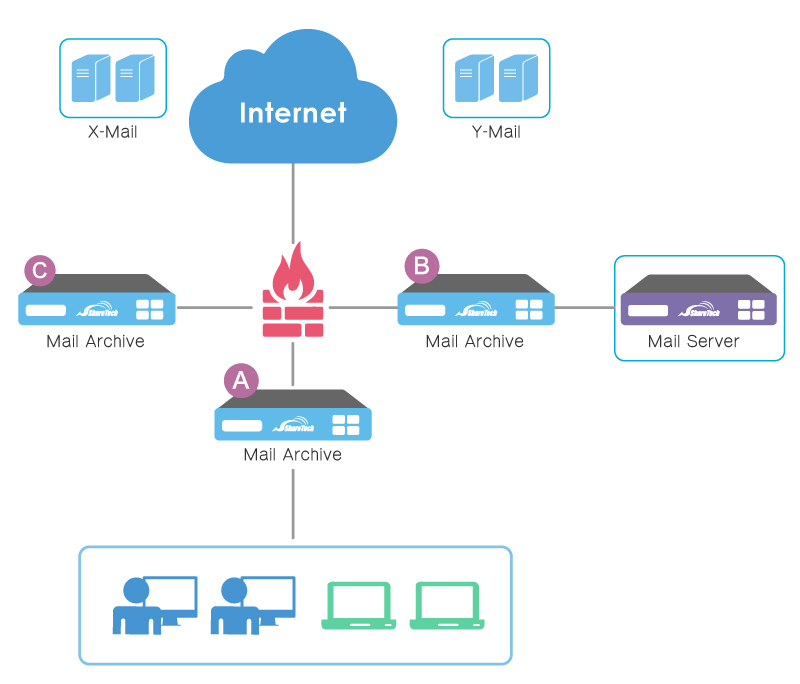郵件主機適用在雲端代管、承租郵件主機空間或是原本郵件主機沒有郵件紀錄器功能,希望利用郵件歸檔伺服器的郵件歸檔功能將所有的郵件備份, 這個模式適用 GMAIL、Office365 或是自己架設的 Exchange Server 上。