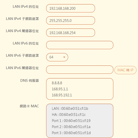 【LAN IPV6 的位址】:設定 IPV6 的 IP 位址。例如:2001:b030:8102:1:260:e0ff:fe65:82d,後面的 260:e0ff:fe65:82d 就是機器的 MAC 位址。