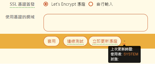 【SSL 憑證簽發】:選擇 Let’s Encrypt 憑證或自行輸入。