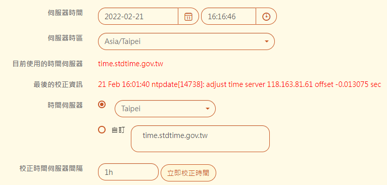 【校正時間伺服器間隔】:系統每隔多長時間與時間伺服器校正時間,預設是 1h,支援單位 天(d)/小時(h)/分鐘,例如:1d/1h/30。