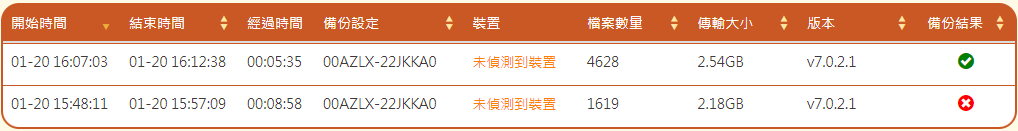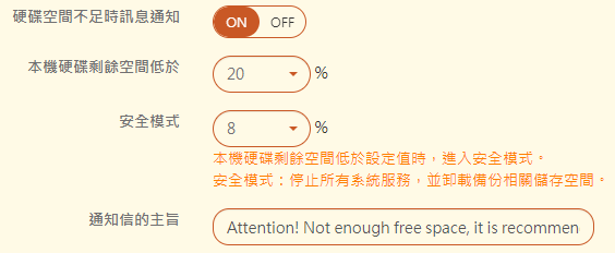 【安全模式】:本機硬碟剩餘空間低於設定值時,停止所有系統服務,並卸載備份相關儲存空間。