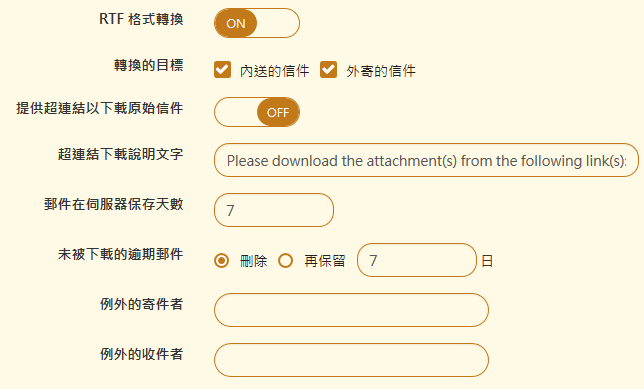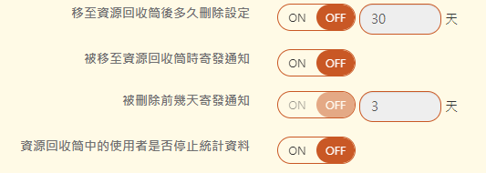 【被刪除前幾天寄發通知】:若啟用【移至資源回收筒後多久刪除設定】並啟用此功能,系統刪除資源回收筒的郵件前會寄發通知信給管理者。