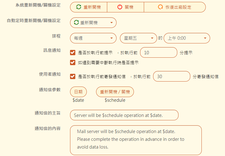 管理者可以操作對整台設備進行關機、重新開機或是定期性的重新開機等動作,也可以將設備回復成出廠預設值。