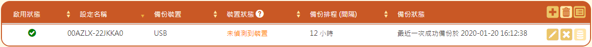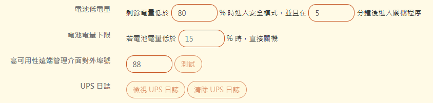 【電池低電量】:當電池的電量低於設定的比例,預設值是 80%,系統就會進入安全模式,此時會中斷對外備份的機制,並且在設定的分鐘數後進入關機程序。