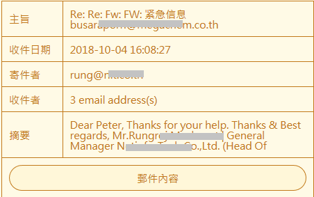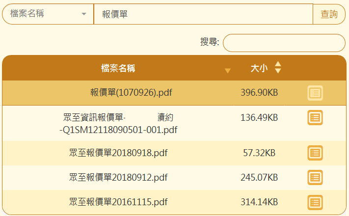 以「檔案」分析: 輸入要查詢的檔案名稱關鍵字,系統就會把附檔名稱含有關鍵字的信件列出,例如:查詢「報價單」。
