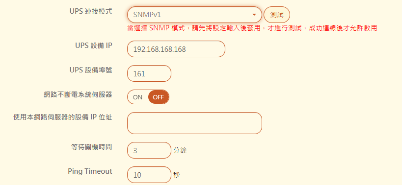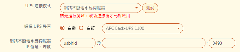 【網路不斷電系統伺服器 IP 位址/埠號】:輸入不斷電系統的 IP 位址及埠號,系統會自動跟不斷電系統溝通。