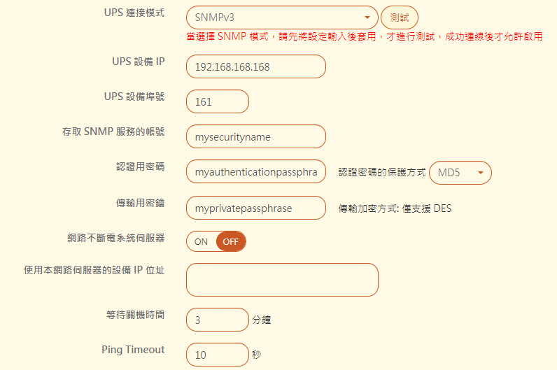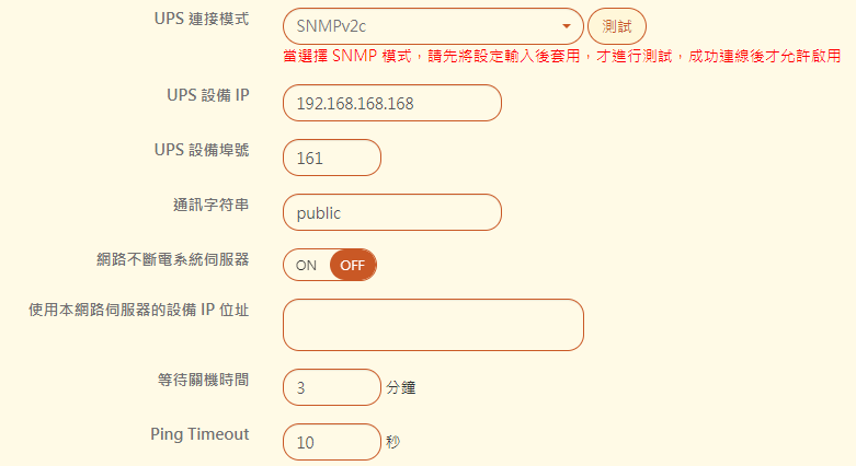 【UPS 設備 IP】:歸檔伺服器會以此IP為目的連線到UPS