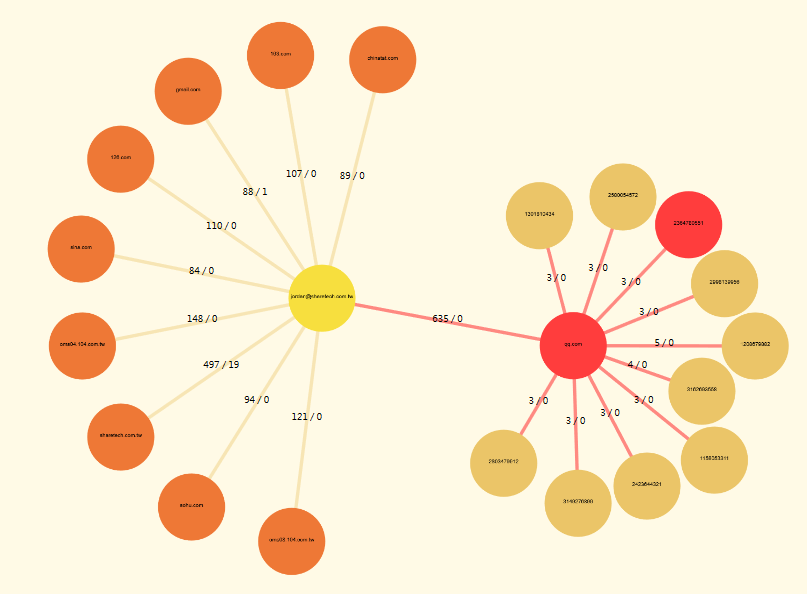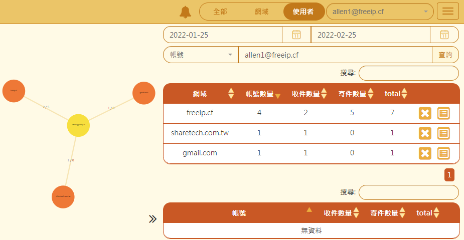 以「帳號」分析: 系統會列出「被查詢帳號」對哪些網域的帳號寄信/收信的分析,藉由這樣的分析圖表,就可以知道帳號之間的通聯頻率。