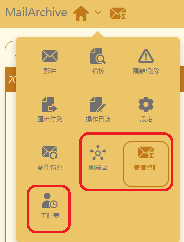 郵件行為分析包含 3 項子功能,分別是關聯圖、工時表及寄信總計,進入使用者查詢介面後,可以在主選單中選取要查看的功能。