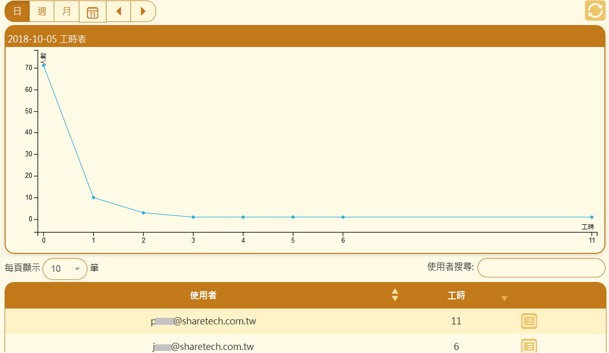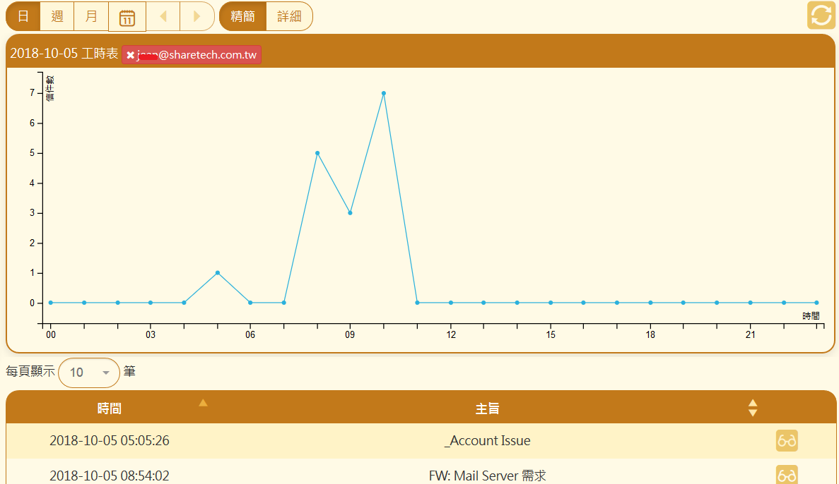 工時表折線圖以時數為橫軸,人數為縱軸,統計的區間可以設為日、週、月或是特定時間區間。 上圖為例,以當日統計郵件工時 11 小時的帳號有 1 個,郵件工時 1 小時的帳號有 10 個。