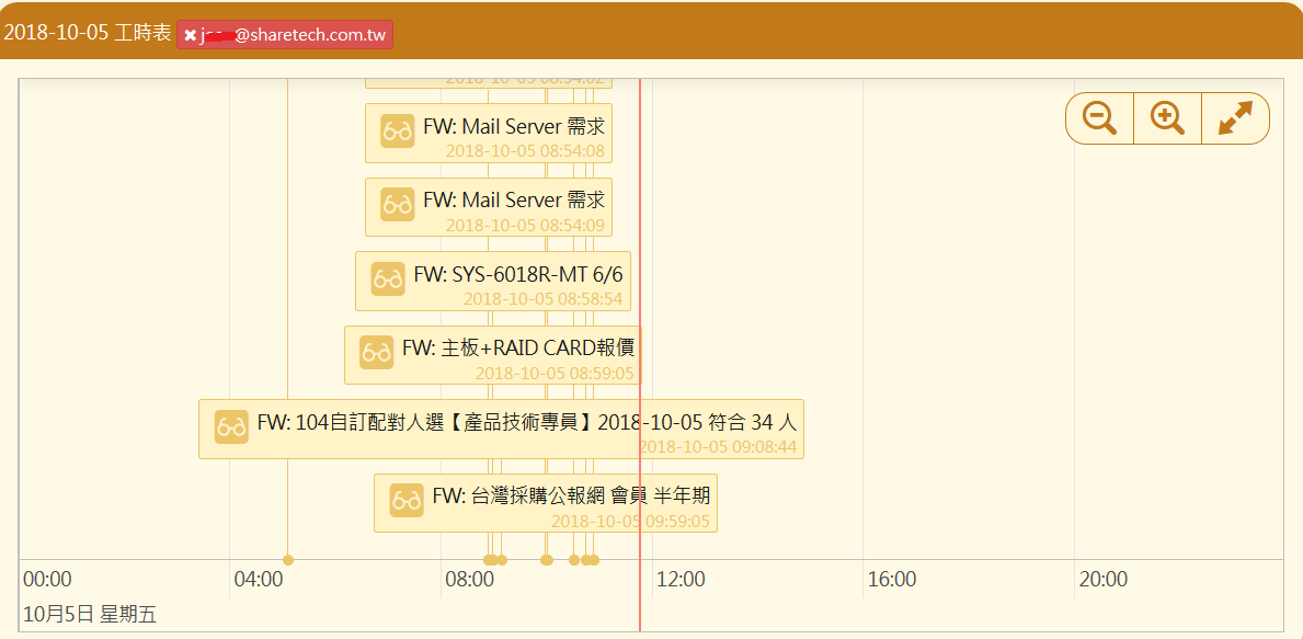 工時表是郵件歸檔伺服器行為分析中一個很重要的功能,基本概念是計算帳號的使用者處理郵件的時間統計值,包含讀信及寫信的動作。 可統計的帳號資料會依據查詢者被設定的權限而定。