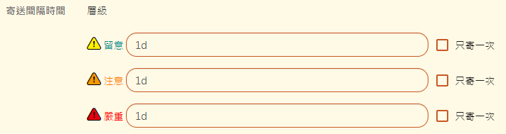 【寄送間隔時間】:以半形逗號分隔寄送間隔時間,支援單位 天(d)/小時(h)/分(m)/秒,當設定為 0 表示不通知。 例如:60,1m,2h,3d,表示寄送間隔為第一次 60 秒,第二次 5 分鐘,第三次 2 小時,第四次之後每 3 天寄送一次。 若只輸入一個值,表示每間隔該數值的時間都會寄送通知,直到錯誤問題排解為止。 勾選「只寄一次」,則在設定的時間會各寄送一次通知。