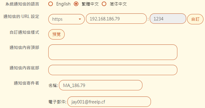【系統通知信的語言】:系統以何種語系發出通知信。支援英語、繁體中文與簡體中文。