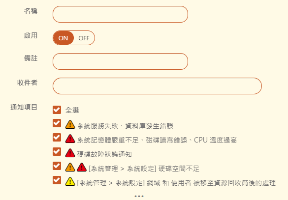 當某些通知項目被觸發時,系統會發出通知郵件給管理者或使用者。此處為關於這些通知信的基本設定。