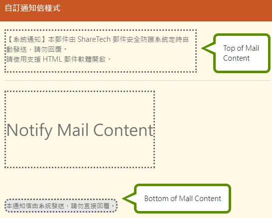 【通知信內容底部】:自訂通知信底部的內容,也就是信件最後。例如:本通知信由系統發送,請勿直接回覆。