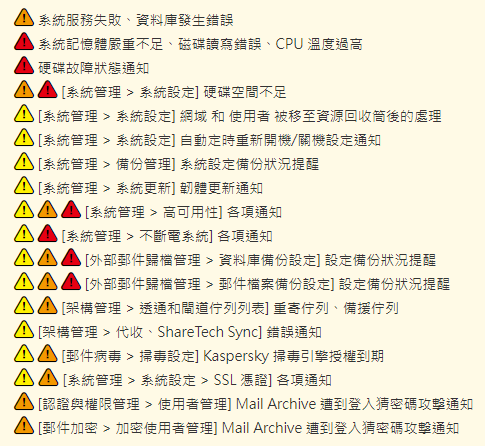 郵件歸檔伺服器把系統訊息通知分成三個等級,留意、注意及嚴重,各層級可設定不同的發送頻率及收件者。 系統發送通知給管理者的方式有 2 種,第一種是電子郵件,另外一種是使用 Line Notify 將訊息傳送到管理者的 Line 帳號。