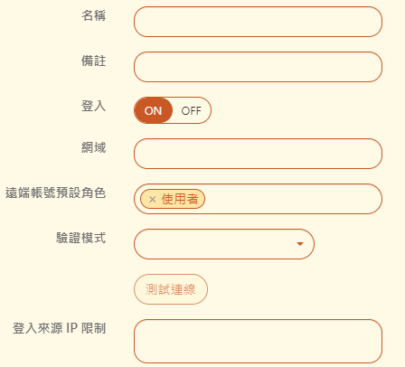 【登入來源 IP 限制】:這個網域的登入者如果不是使用設定的來源 IP 位址,將會被拒絕連線。可以一行一筆,多筆輸入。 若空白代表不啟用此功能,任何來源 IP 位址都可以登入。