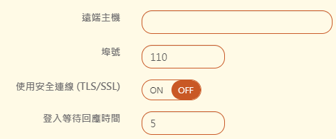 選擇 POP3 驗證方式,就是希望登入的帳號密碼跟原本的郵件伺服器一樣,因此在設定區輸入 POP3 主機的 IP 位址或是網域名稱、 埠號(預設是 110,如果有啟用 SSL 則是 995)、是否用加密連線及設定登入等待回應時間(超過設定值,驗證程序就會被中斷)。 為了安全因素,建議採用安全連線驗證。
