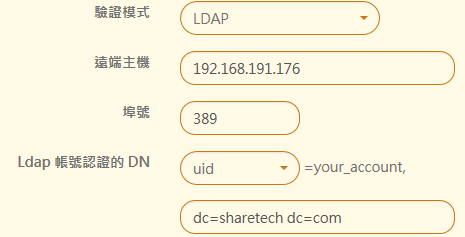 輸入 LDAP 主機的 IP 位址或是網域名稱、LDAP 使用的 PORT 號(預設是 389)及選擇 Ldap 帳號認證的 DN 是使用 UID 還是 CN, 後面的 dc=sharetech dc=com 就是網域資訊。
