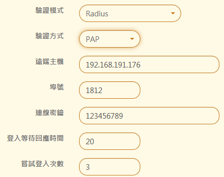 首先選擇驗證的方式是用 PAP 還是 CHAP,接著輸入 Radius 主機的 IP 位址或是網域名稱、使用的 Port 號(預設是 1812)、 跟 Radius 伺服器連線時使用的密鑰、登入等待回應時間(超過時間將會中斷這次的驗證)及嘗試登入次數。