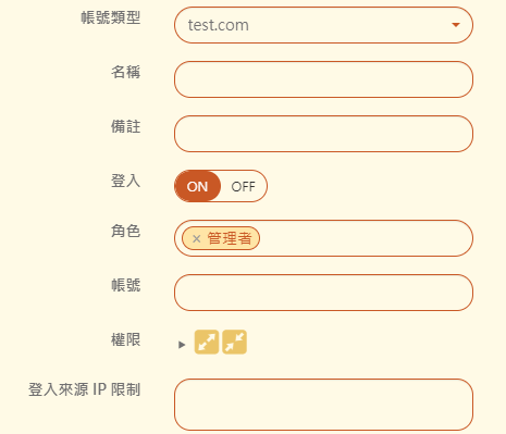 【權限】:若選擇為管理者才會顯示此設定,可編輯此帳號對於管理介面中所有設定項目的讀取或是修改權限。