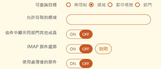 【IMAP 郵件還原】:是否啟用查詢者介面郵件還原功能,請先至「網域管理」設定 IMAP 郵件還原的遠端主機。