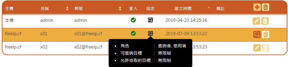 並不是設定的網域內所有帳號都能夠登入系統,管理者可決定網域內的哪一些帳號可以登入, 並且設定該帳號的角色是管理者/查詢者/使用者這三者其一或皆是。
