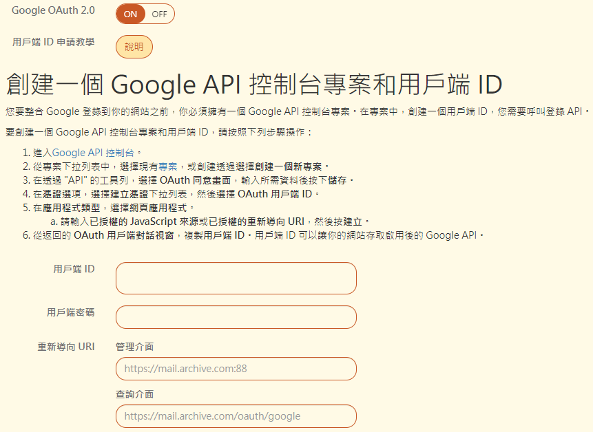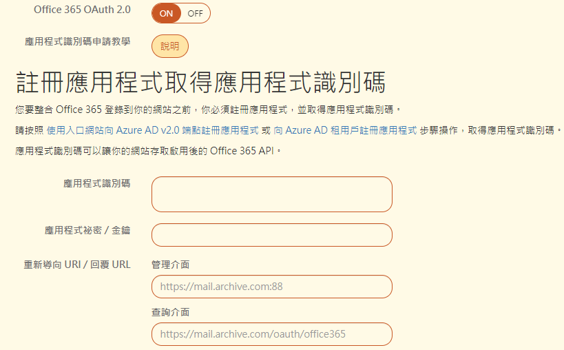 【重新導向管理介面 URI】:具有管理權限的用戶 ID 在 Office365 認證成功後,要轉向哪一個 URI,一般會設定轉向郵件歸檔伺服器的管理介面。