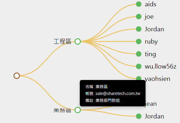 一個典型的部門或是群組帳號如下圖所示,網域內分 2 個部門(業務/工程),每一個部門下有多個成員,並且成員可以屬於多個部門。 業務部門的虛擬帳號是 sale@sharetech.com.tw,當郵件歸檔伺服器記錄的郵件收件者有這個帳號,就根據設定,將此郵件歸類到部門成員中。