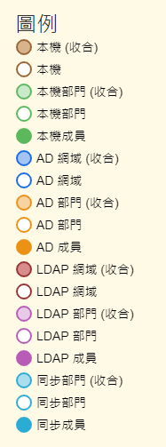 「部門管理」以樹狀架構呈現,每個節點的顏色是依據此部門是以「本機/AD/LDAP/同步」何種模式建立來分類。