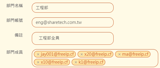 【部門成員】:點選此欄位可以從選單中選取,或直接輸入帳號(必須已在 7-2、使用者管理 建立)。