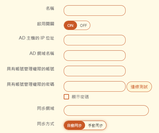 【具有帳號管理權限的帳號 / 密碼】:填寫後可點選連線測試確定可連到 AD server