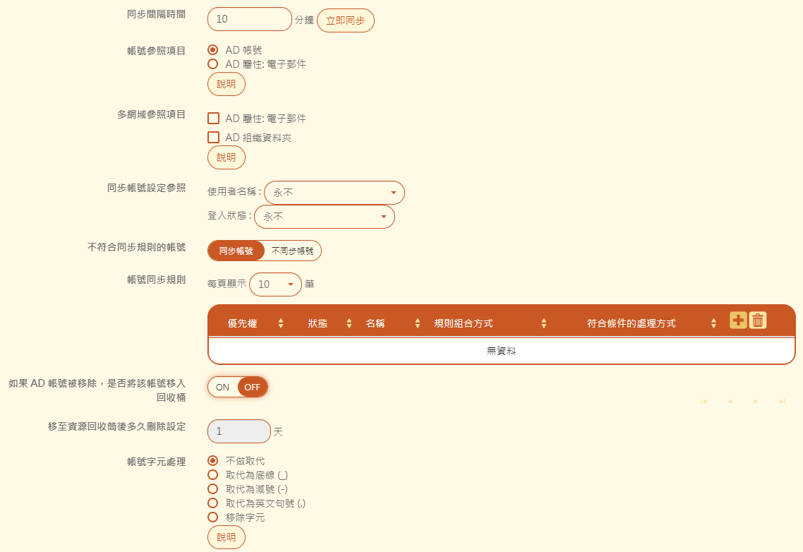 若帳號有特殊字元不做取代,或取代、移除後的帳號只剩特殊字元,該帳號將無法被同步。詳細請參照說明.