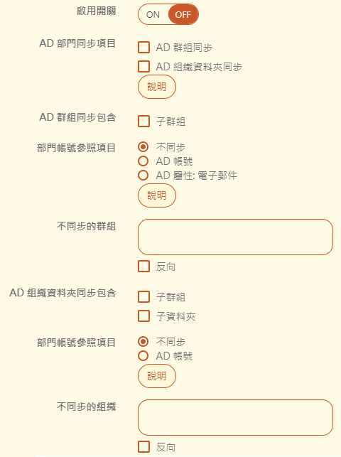 【部門帳號參照項目】:是否要同步部門帳號,若同步則選擇使用的屬性。詳細請參照說明。
