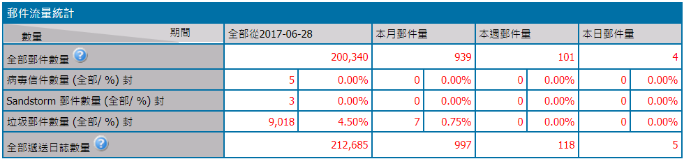 【全部郵件數量 (接收/傳送) 封】: 目前郵件伺服器總共接收的郵件數量,接收的部份包含垃圾郵件。