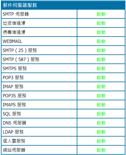 說明目前服務啟動狀態,包含 SMTP 伺服器、垃圾信過濾、病毒信過濾、Webmail、SMTPS 服務、POP3 服務等等。