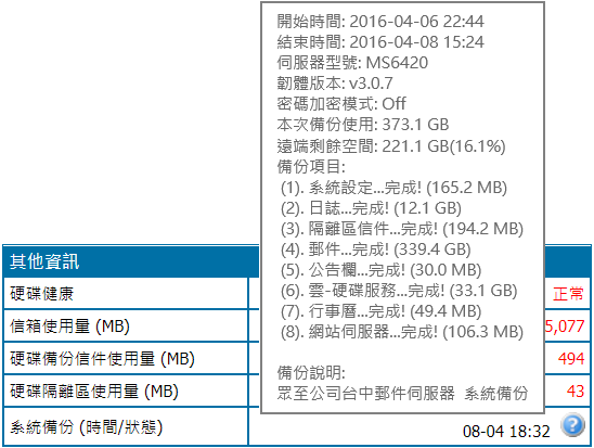 【系統備份 (時間/狀態)】: 系統上一次整機備份的時間及是否成功。將滑鼠移到