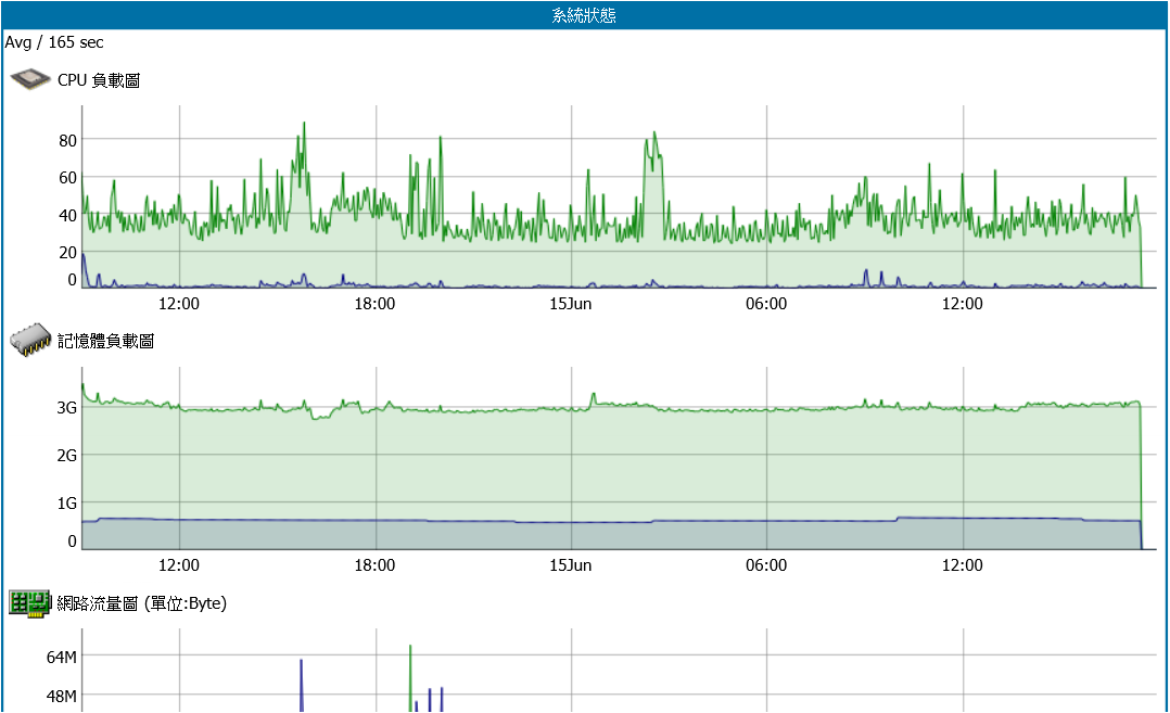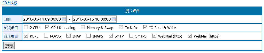 在首頁的系統資料為即時狀態,如果想要查詢歷史的流量資料,可點選系統狀態頁面上方的 歷史記錄,依條件搜尋特定時間的資訊。 搜尋結果以 CPU 主機負載圖、記憶體負載圖、網路流量圖、硬碟負載圖、服務流量圖等顯示。