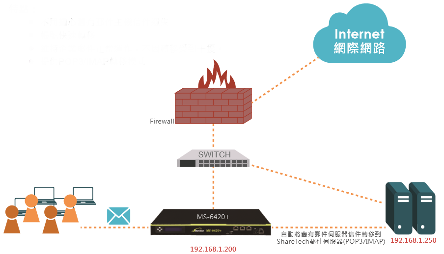 「郵件傳送/接收」、「垃圾/病毒郵件過濾」、「郵件紀錄」,這 3 項功能是郵件伺服器的基本應用, 下圖顯示為此基本網路架構,把郵件伺服器放在防火牆後面,所有進出的郵件都會經過它。